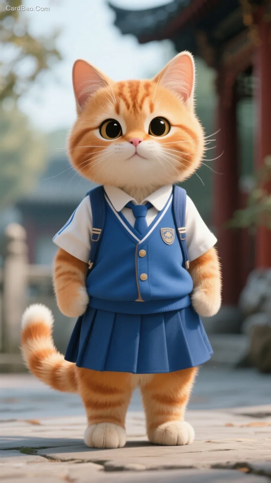 A personified little orange cat, dressed in a blue school uniform, in a realistic photography style, with 8K ultra-high-definition quality, cinematic texture, and Chinese ancient-style cartoon elements.