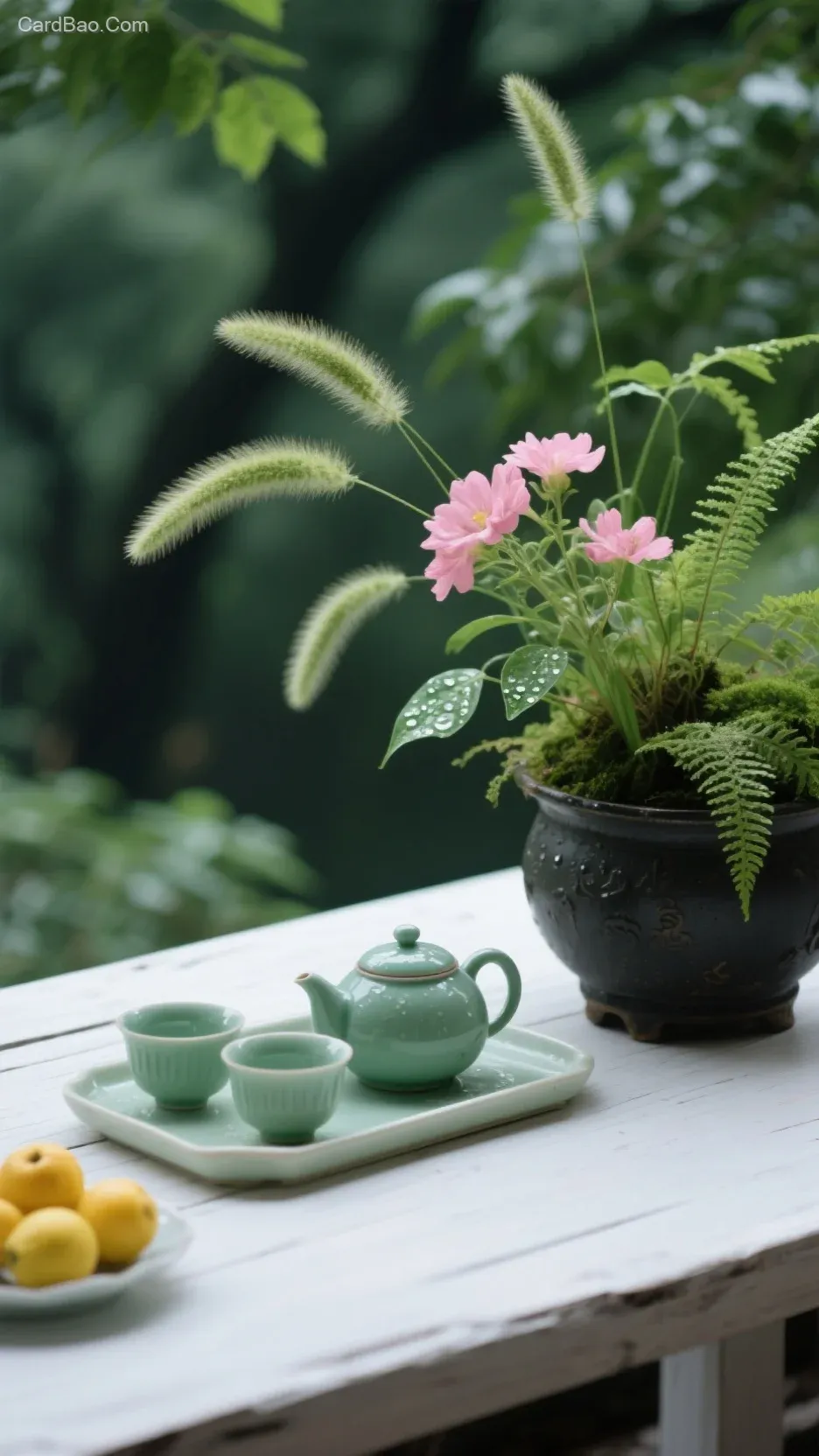 A picture depicting a scene of leisurely Chinese life, featuring lush green plants in the foreground with fluffy foxtail grass and pink blooming flowers. These are paired with simple, rustic black flowerpots containing ferns and dewy leaves. The background consists of softly blurred deep green leaves, creating a natural atmosphere. Below, a set of cyan-green Chinese tea ware is arranged, including a teapot and teacups placed on a light-colored tray. Next to it is a plate of yellow fruits. The bottom of the image shows a white wooden tabletop. The overall color palette is fresh and natural, with a tranquil and cozy ambiance, conveying a sense of peacefully enjoying life and savoring tea while reflecting on life.