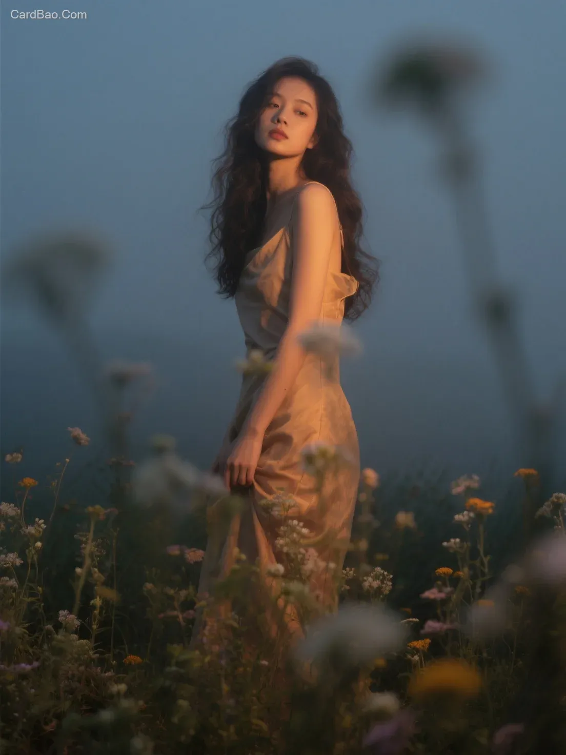 暗蓝调,隐约的橙黄褪色,泛朦褪色,磨砂玻璃的朦胧感,高颜值,长卷发,低饱和,泛光模糊晕染,人体艺术,胶片颗粒质感,灰度摄影美学,前卫艺术美学,一片野花点缀