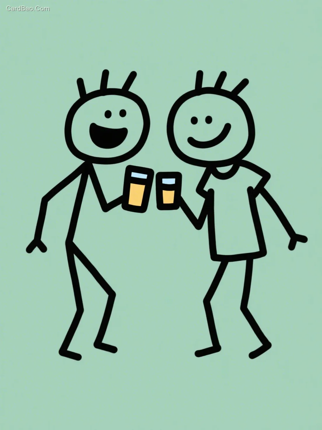 卡通,粗笔线条,两个火柴人,大笑,简笔画,极简风格,头上三根毛,喝酒