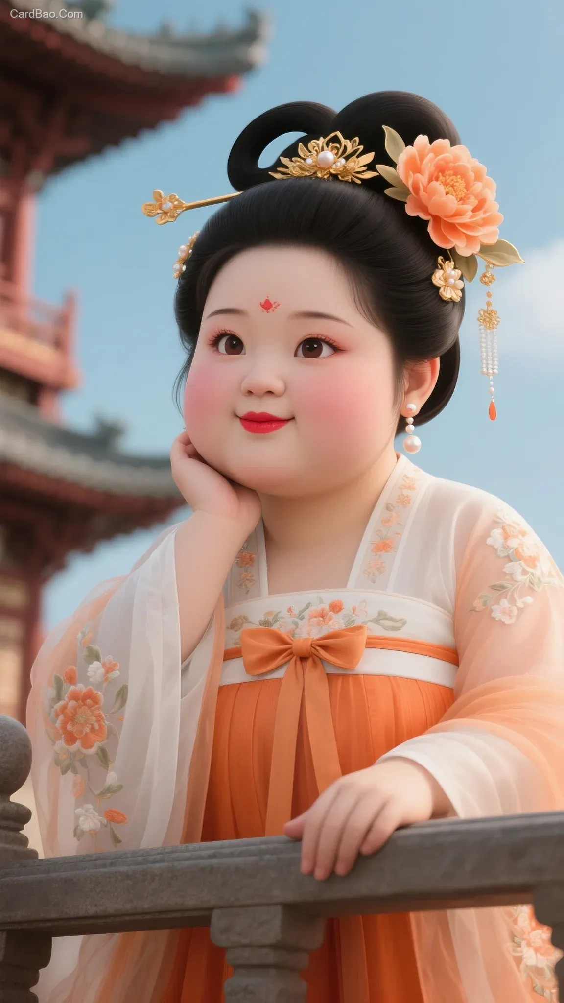 在D渲染风格,超现实主义,一个胖嘟嘟很可爱的古代女子,五官精致,大眼睛双眼皮,眉型为细长的柳叶眉,眉色自然,双眸明亮有神,呈杏仁状,透着温婉灵动之感,鼻梁小巧精致,恰到好处地勾勒出面部立体感,唇形饱满。途有鲜红的口脂,嘴角微微上扬,似带着一抹浅笑,流露出亲和气质。她的头发乌黑亮丽,梳成了经典的唐代倭堕髻,倭堕髻插浅橙色大朵牡丹花头饰,发髻高耸且富有层次感,线条优美流畅,一侧别着精美的金色发簪,发簪造型繁复,雕琢着精致的花卉或藤蔓纹样,末端垂有小巧的坠饰,随着人物动作微微晃动,另一侧装饰有华丽的金质花钿头饰,增添了几分雍容华贵。