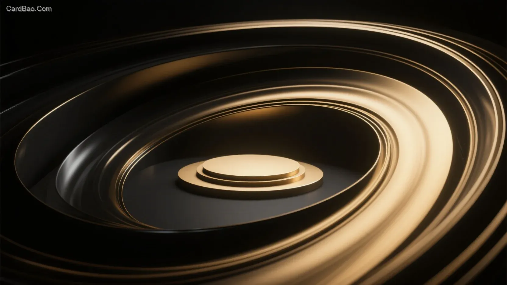 A vortex tilted at 90 degrees, with a raised circular platform at its center exposed. The platform emits diffused light, featuring a black and gold metallic texture. The vortex gradually expands outward and seamlessly merges into the background. The integration between the vortex and the background is perfectly smooth, set against a black backdrop. It exhibits a sense of motion, isometric perspective, spatial depth, and a frosted metal style. The light effects transition naturally, with a complete structure, high-definition texture, and 16K resolution.