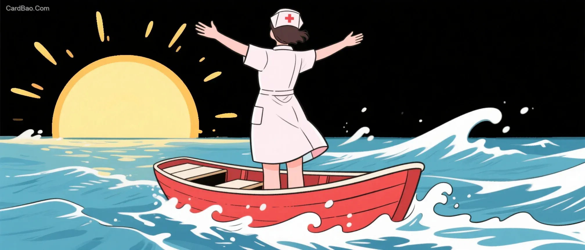 生成一幅免抠图png格式图片!!一个穿着护士服的人背对画面,张开双臂、站在乘风破浪行驶在大海上的红船上拥抱耀眼朝阳的画面,散发青春洋溢感又气势恢宏,漫画线条简洁明快。