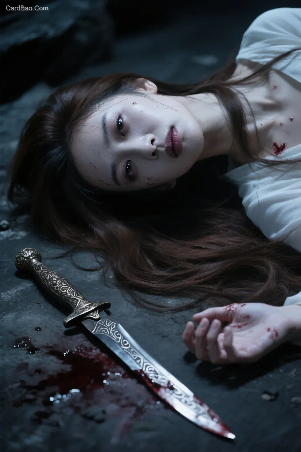 王楚然,被杀倒在地上,双眼无神,瞳孔放大,眼睛表现出淡淡的白色雾状,地上有一把精致复古大马士革匕首,栗棕色飘逸的长发,白皙的皮肤,精致漂亮柔美的面部,凶案现场,现代中国艺术,柔和的光线,分层形式,俯瞰,电影镜头,暗黑系,恐怖主题,4k,完美构图,超详细的细节,特写镜头,冷色调,柔和光线,静态,神秘,冷峻。真人级高精度建模处于复杂光影环境,皮肤呈现毛孔级细节与自然皮下血管理论 美学词:SSS次表面散射模拟皮肤透光质感,汗毛按真实密度分布,微表情牵动面部46组肌肉群,虹膜内水晶体折射环境光 专业词:8K PBR材质配合16K法线贴图,动态角质层光泽随湿度变化,全局光照系统计算多光源柔影,瞳孔直径随光照强度自动调节,发丝使用曲线引导的13万根独立模型,衣物纤维按材质重量自然垂坠,皮肤油脂层反射高光点,手指关节处呈现压迫性形变,环境光遮蔽强化物体接触阴影,毛细血管网在强光下可见淡青色脉络