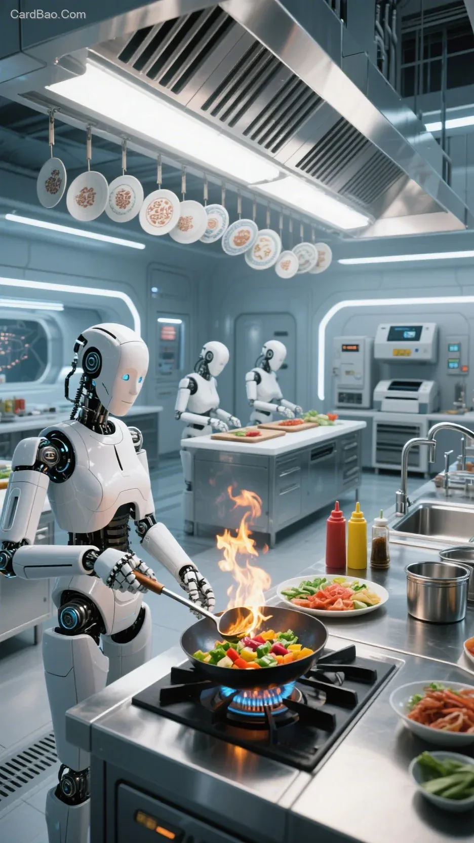 未来的中餐厨房,两个高科技机器人在灶台前炒菜,左侧机器人手持炒勺翻炒五颜六色的食材,炒勺上有跃动的火光,白钢排烟罩和吊架上挂满中式餐具,后方两台机器人在白钢工作台的菜墩上切菜,调料缸、调料瓶、厨房打印机、不锈钢水池等设施,场景宏大充满科技元素,好莱坞式布景,电影级广角构图,专业布光技术,高动态渲染,超高清细节