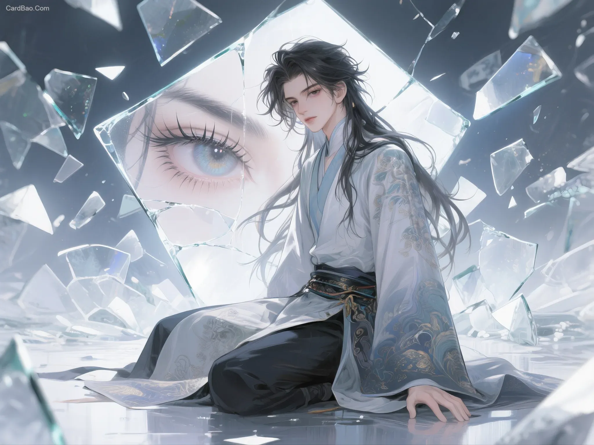 插画,帅哥,坐在地上,笔触,线条清晰,明暗对比,超高清,垂坠感,高级感,最高画质,绝美眼睛,长睫毛,凌乱的长发,痞帅勾人。清透的皮肤,强光,细腻渲染,绝美眼睛,邪魅,细节五官。丰富细节,朦胧感,微聚镜头,面部阴影,面部聚焦,丰富的细节,凌乱发丝拂面,高质量,写实逼真,艳丽的油画质感,细腻肌理,bjd,少年,半身,全身。传统国风服饰,背景:无数玻璃碎片,中间是一个大碎片,碎片反光。