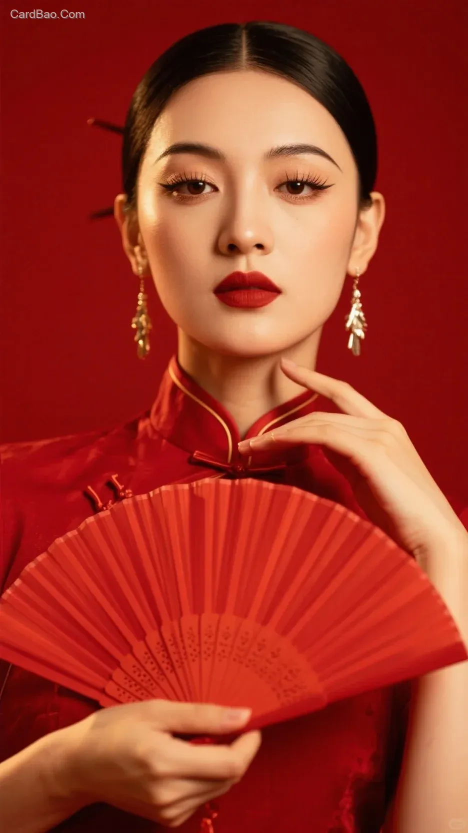 一位中国美女戴着红色背景的耳环,脸上闪耀着光影,构图对称,穿着红色旗袍。她有长长的睫毛,一只手拿着一把红扇子,另一只手摸着脸。她妆容精致,姿态优雅,色彩艳丽,氛围神秘。张静娜的风格