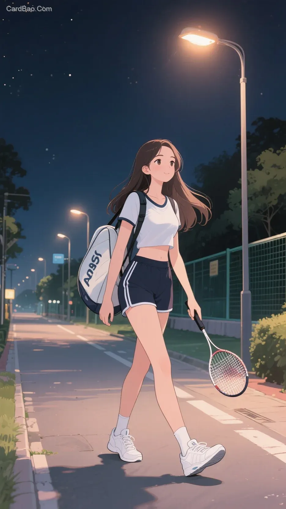 治愈系插画,动漫风,画面柔和清晰,无手绘质感。 时间:晚上。场景:有路灯的街道上。人物:25岁长发女生御姐范穿着休闲装,上身运动短服。脚上穿着白色运动鞋,背着羽毛球拍包。内容:晚上,女生走在去去毛球馆的路上。整体氛轻松愉快 整体氛围温馨,色调柔和