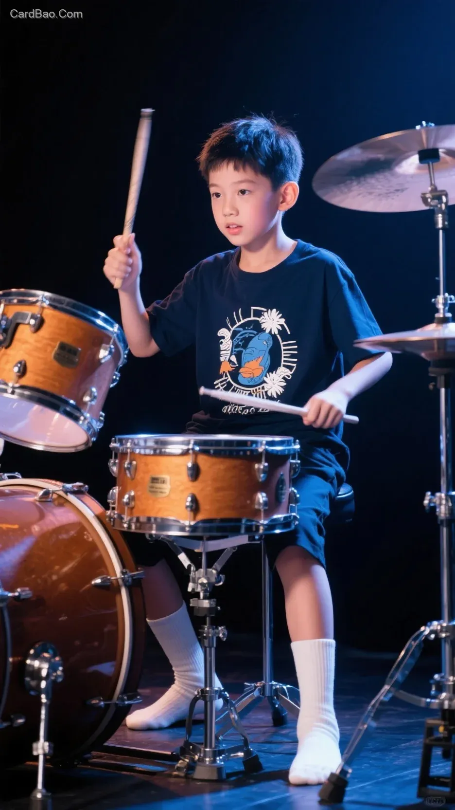 一个13岁小男孩,潇洒英俊,身穿深辉色T恤,带图案。神采飞扬,在舞台上演奏架子鼓。穿着白袜,没穿鞋
