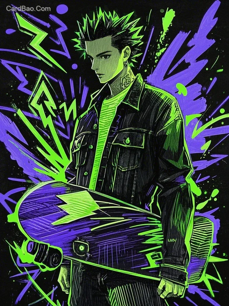 Paper cutting art, traditional paper cutting, line doodles, drawing board, deconstructivism, hand-drawn style, ultra-fine lines, doodle-line cartoon male character. A side-standing skateboarder pose with asymmetrical hair and angular jawline, outlined with wild lightning-like zigzags and jagged lines. Rough brushstrokes interwoven with delicate short lines depict denim jacket textures, using fluorescent green and dark purple marker tones for contrast. The background features splashed turbine-like lines and street graffiti symbols, retaining digital pencil sketch textures. Neon light particles are added at joints, while the face maintains an unfinished sketch-like line quality. The overall composition showcases the rebellious tension of street culture colliding with digital art, conveying a sense of free-spirited youthful energy.