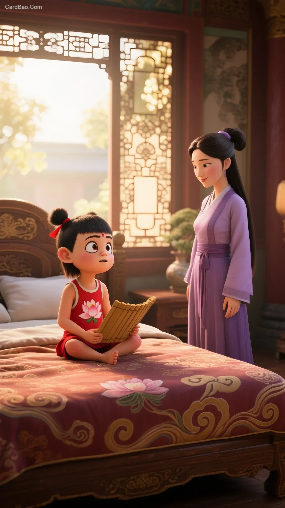 在汉风浓郁的皇家卧室,檀木床榻之上,铺陈着绣有如意云纹的锦衾。窗外,暖阳透过雕花窗棂,将细碎的光影倾洒在床畔。身着红色莲花图案背心的小哪吒,端坐在榻上,手中紧握着竹简,乌亮的双眸满是纯真与好奇,正目不转睛地看向母亲,微微张嘴,似有无数疑问亟待出口。与哪吒相距一米处,一旁的高马尾长发的殷夫人,身着浅紫色深衣,衣袂飘飘,面容温婉,同样微微张嘴,眼神中满是宠溺与耐心,仿佛下一刻便要为小哪吒解惑。整个画面温馨祥和,尽显皇家母子间的深厚情谊。(3D立体,色调柔和,迪士尼皮克斯工作室风格的肖像摄影,3D渲染,柔焦,最佳画质,8K,超级详细,简洁,可爱。)