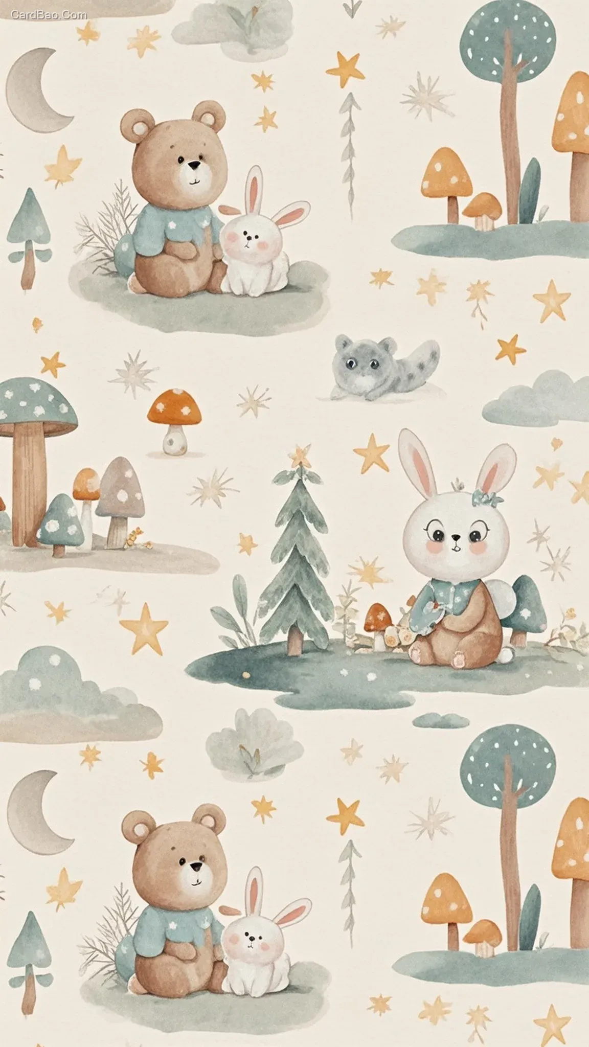 复古水彩风格儿童印花图案,主题包含手绘兔子、小熊、小蘑菇、星星和月亮,柔和色调,圆润线条,低饱和度配色,手绘质感水彩晕染效果,四方连续构图,元素重复排列无断裂感,无缝拼接技术,符合婴童纺织品印花市场主流风格