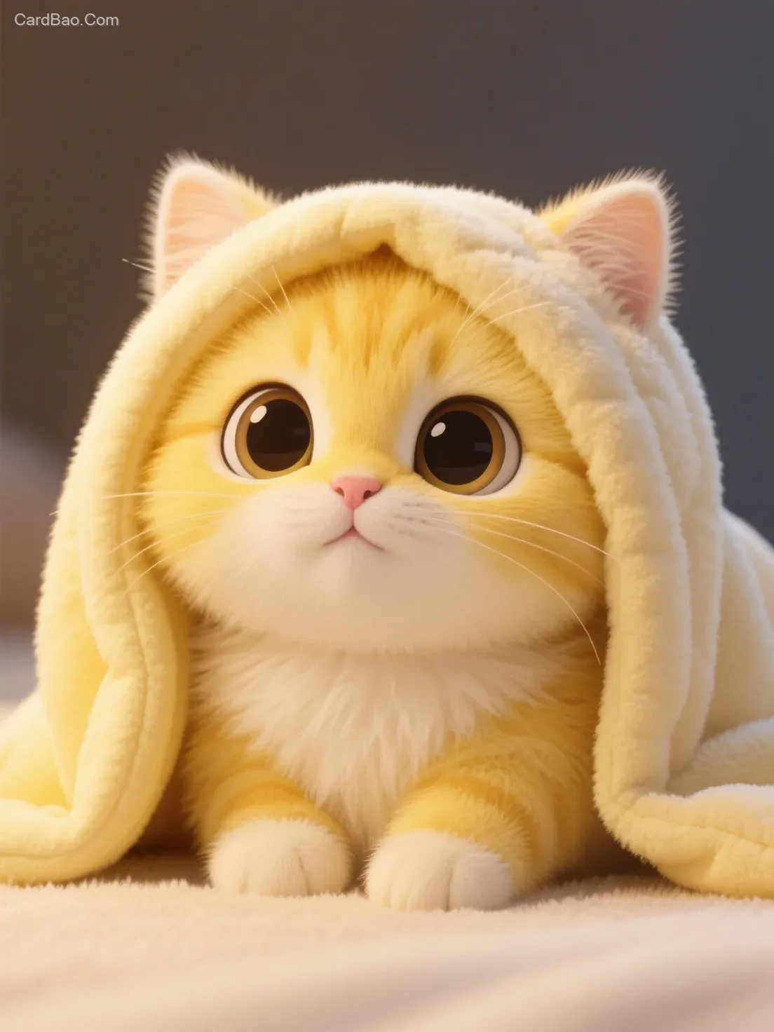 Cartoon wallpaper, a fluffy yellow kitten with a creamy yellow blanket over its head, an extremely cute expression, and big eyes. Exceptionally adorable, high-definition.