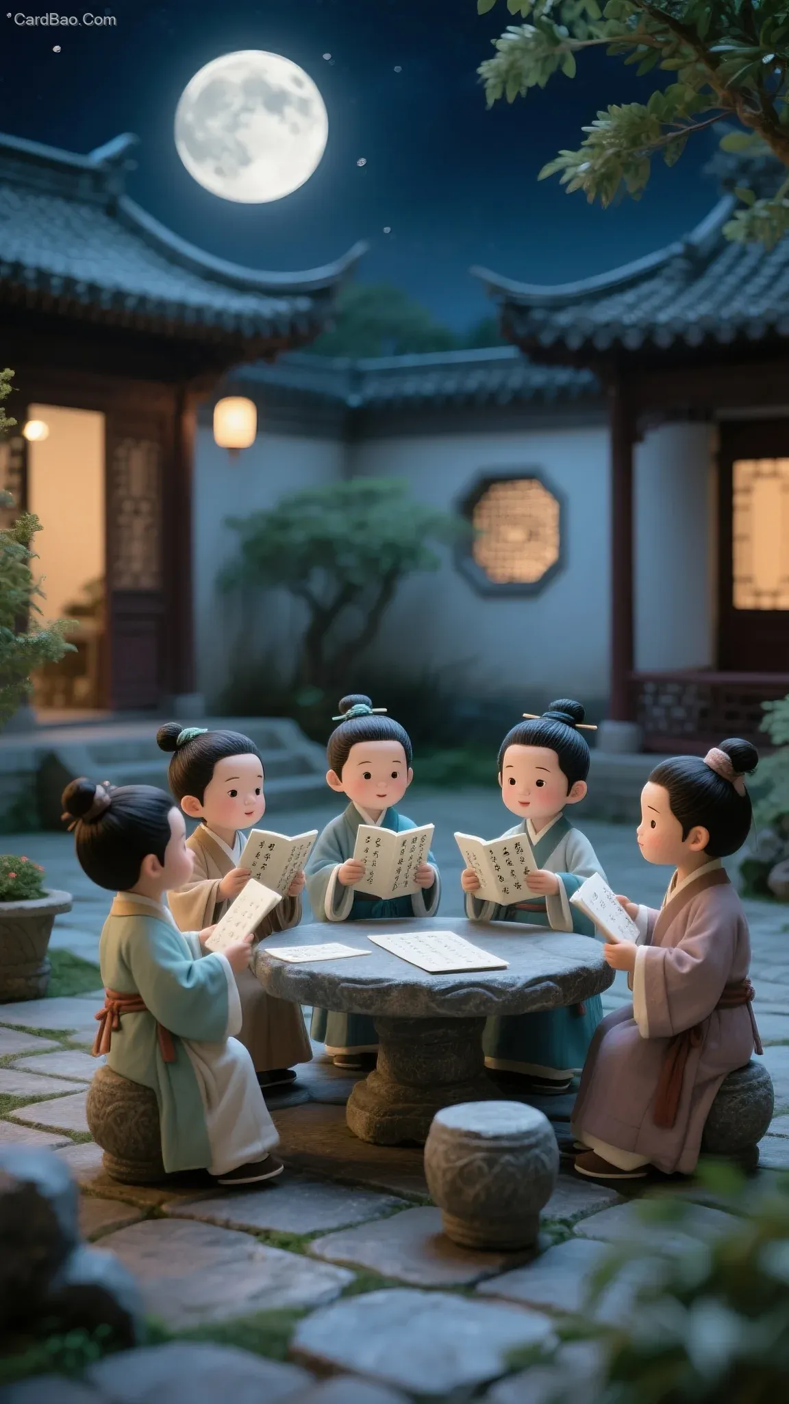 这幅图呈现了一幅充满趣味的古风场景。画面中,几个身着古代服饰的孩童,缩小版的,高数倍的素材奇幻与古朴交融,给人新奇又诙谐的视觉感受。一个宁静的夜晚,月光洒在庭院里,几个缩小版的古代孩童身着古装,围坐在石桌旁,手持诗集,正在声情并茂地朗诵着古诗。
