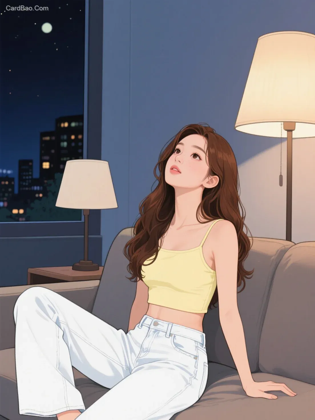 韩国插画,夜晚,一个美丽的女性,身穿浅黄色露脐上衣,白色宽腿牛仔裤,棕色长卷发,抬头向上看落寞随性靠坐在沙发上,沙发边有台灯