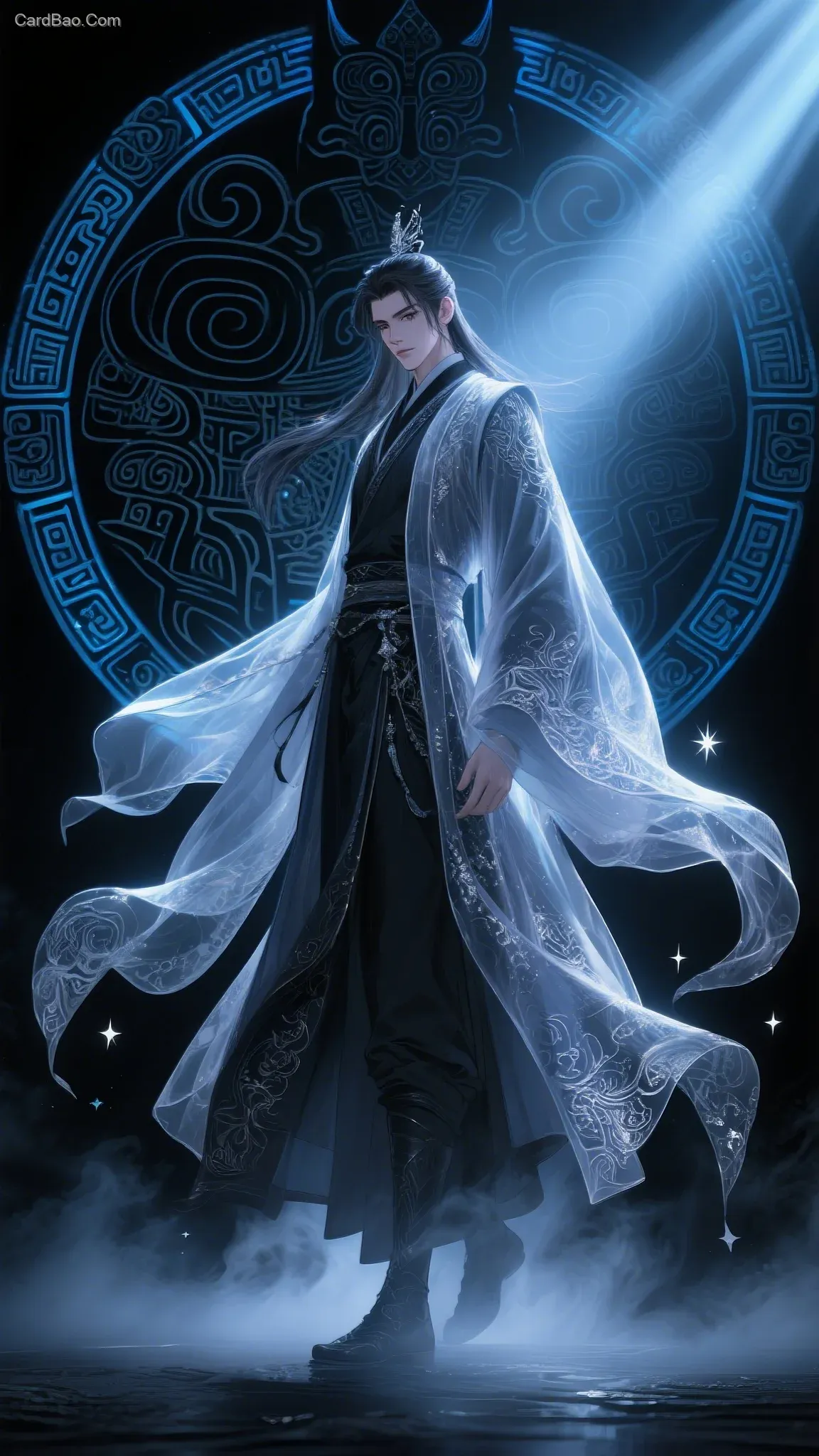 动漫男神面部特写,他的背景复杂古代图腾纹样,图腾边缘泛蓝色荧光,暗黑色玄幻色调背景,强烈丁达尔光束穿透画面,星纱材质长衫随风飘动,精细刺绣纹理可见,高对比光影塑造立体五官,神秘烟雾缭绕脚部,8K超清细节,电影感构图