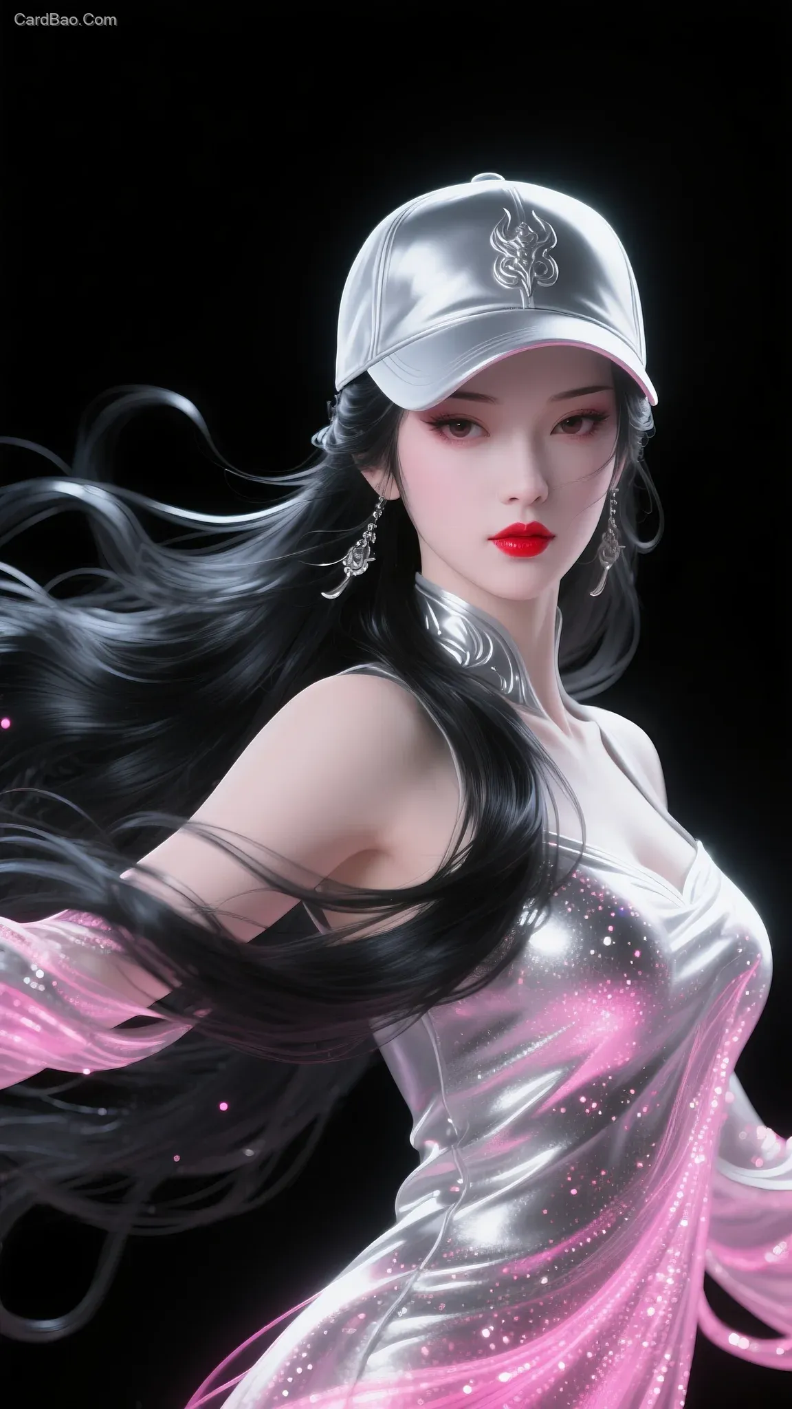 长发美女舞者,人美,身材曲線姣好,头戴棒球帽。其头发被白色内发光絮状丝紧密贴合,沿发丝走向延展。上身衣物由紧密的白色内发光絮状丝编织,散发柔微光。她的身体轮廓同样附着有致密内发光絮状丝,向外发散,内发光效果融合生物光和全息投影元素,于黑色背景衬托下,超现实氛围浓厚,动感与优雅完美融合。构图完美,超高清画质,全息投影,柔和光,粒子发散,灵魂抽丝。绝世容颜的古族熏儿,倾国倾城,烈焰红唇,傲人的身材,国风15万根长发由纤细银白光绘线条构成,长发金属质感,3D立体,大波浪流水般发丝自然柔美,纯黑背景中发光线条与暗部形成强烈对比,造型兼具空灵与梦幻感,唯美,惊艳,华丽,正面特写,绝美,半遮脸,魅意,银光瞳,傲慢,80000000000K超清细节展现光迹的精密轨迹,极简主义美学结合高动态范围渲染,800000000000K动态光影在整顶长发形成微妙流动效果,80000000000000K肌理感肌肤,四维深度真实空间感,10000000000000K超清画质,消除一切影响清晰度的不良因素,古风,岩彩板绘,白皙肌理磨砂,幽蓝暗黑魔幻,新三维古风,奢华,精美闪耀流苏,国风光影,三维粒子,亮片,生物发光,发光粒子,粉红唇釉光亮,80000000000K超高清像素,6400000000K高清出图,面对镜头,温婉美人,古风美女面孔,五官精致,18万根秀发黑色发色,丰满设计,背景马卡龙黑冷色系,封神榜绝色美女苏妲己,中国古风人物形象。艺术感。80000000K超清电影画质。消除一切影响清晰度的不良因素。