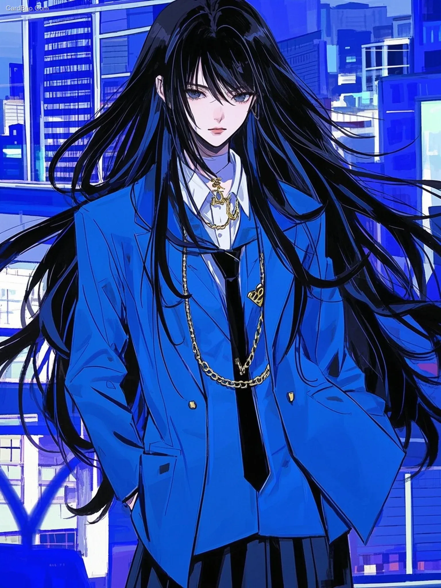 时尚前卫的漫画风格,兼具日漫的精致与韩式插画的潮流感,飘逸黑发与西装校服服饰的二次元女生,超冷漠极简风格,Lnplick的画风。