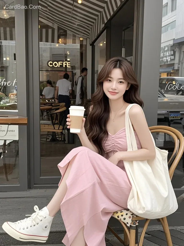 艺术风格,个子高挑的女生,一位身着浅粉色吊带连衣裙的长发大波浪精致女孩,背着白色布袋,穿着白色高帮帆布鞋,在咖啡店前,坐着喝咖啡在自拍,宽松长裙,长发