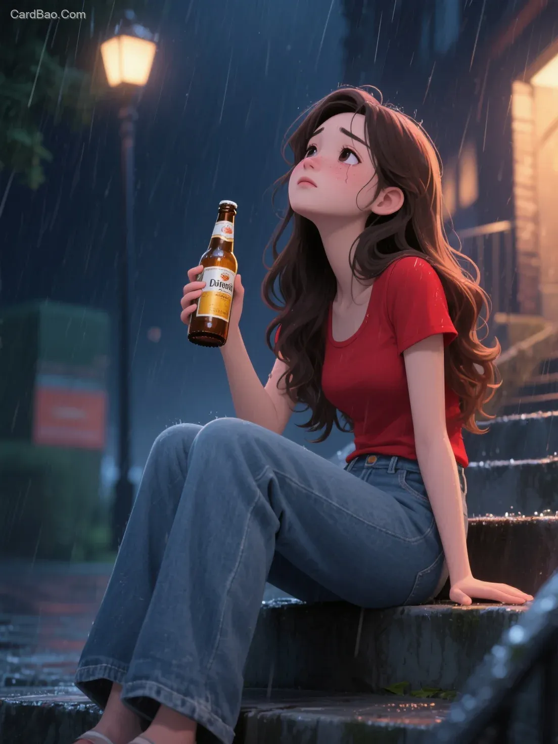 温柔有气质的女孩,卡通风格,仿真人,皮肤细腻,长卷发,红色上衣,宽腿牛仔裤夜晚,坐在台阶上,仰头,下雨,,手里拿着瓶装啤酒,眼神有淡淡的忧伤,灯光,给人一种颓废疲惫感,9:16