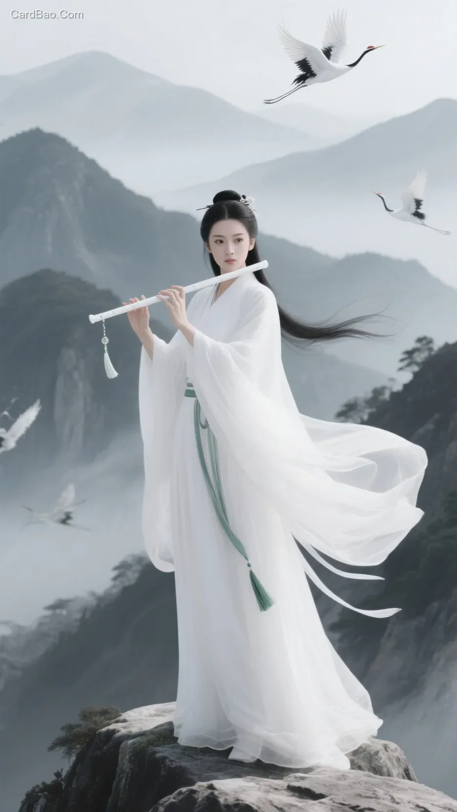 "A woman in white Suzhou embroidery stands atop a mountain peak, her hair lightly tied up in an elegant bun. Her sleeves flutter gently in the wind, exuding an ethereal and immortal aura. The background features layered distant mountains and flying cranes. She holds a white jade flute in her hand, her features as exquisite as a painting, with a clear and cool gaze. A green silk tassel is tied at her waist. The composition is filled with blank space and classical poetic charm. The scene is beautifully crafted, with perfect structure, light and shadow, a dreamlike quality, golden ratio, cinematic texture, and ultra-high-definition quality."