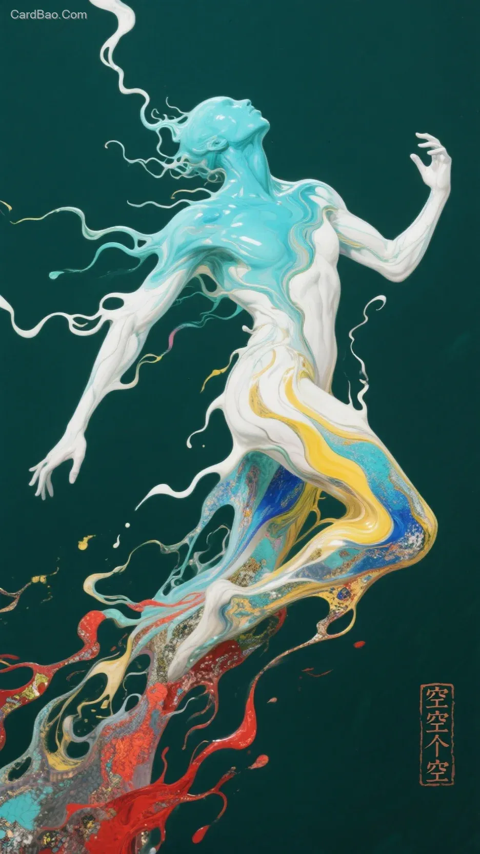 A liquid composed of sky blue, moon white, willow yellow, stone blue, deep red, mineral pigments, and black-gold forms a human figure. Against an emerald green background, create a dreamlike world that appears to cascade, howl, and dance. Abstract art, exaggerated expressiveness, artistic flair, with graceful lines. A seal in the lower right corner reads "Empty of Emptiness."