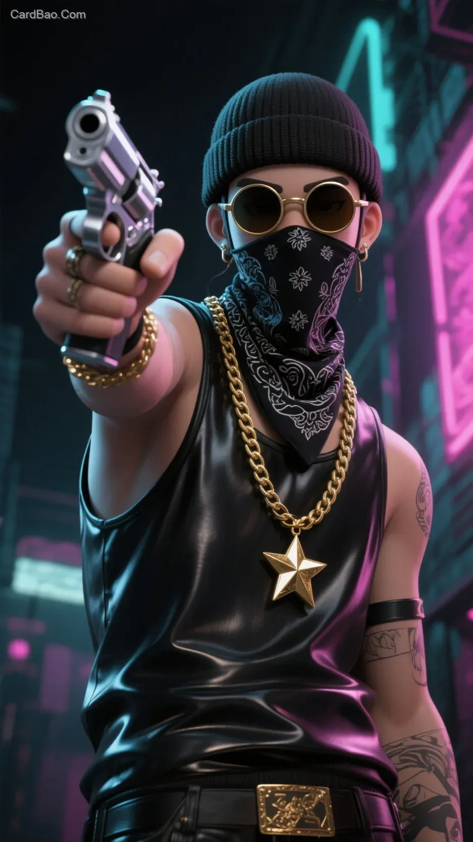 This is an anime character with a trendy and edgy style. The character wears a beanie, round-frame sunglasses, and a patterned black bandana covering the lower face. They are dressed in a sleeveless top, adorned with a large gold chain and a star-shaped pendant. Holding a pistol, they make a pointing gesture. The overall design aims to create a cool, street or gangster-inspired persona, exuding an untamed and commanding aura. Stylistically, it aligns with an "American" urban cool aesthetic, reminiscent of the distinctive characters often portrayed in American-style anime.