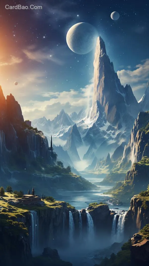 High mountain waterfall, planets very close, beautifully fantastical, vibrant colors, blue sky, distant village, imagined world, high contrast, dreamlike realm, strong sense of depth, natural lighting, creative composite.
