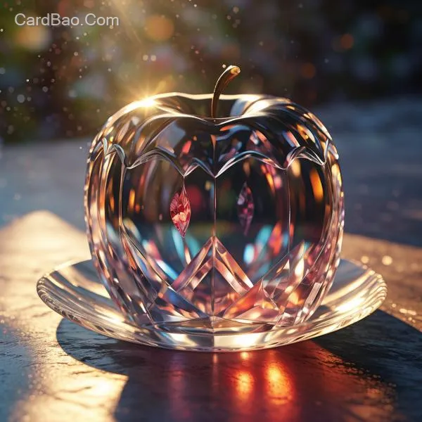 A prismatic crystal apple, placed in a glass dish on a table, with sunlight, clean and fresh composition, light color palette, high-definition, rich in details, realistic.