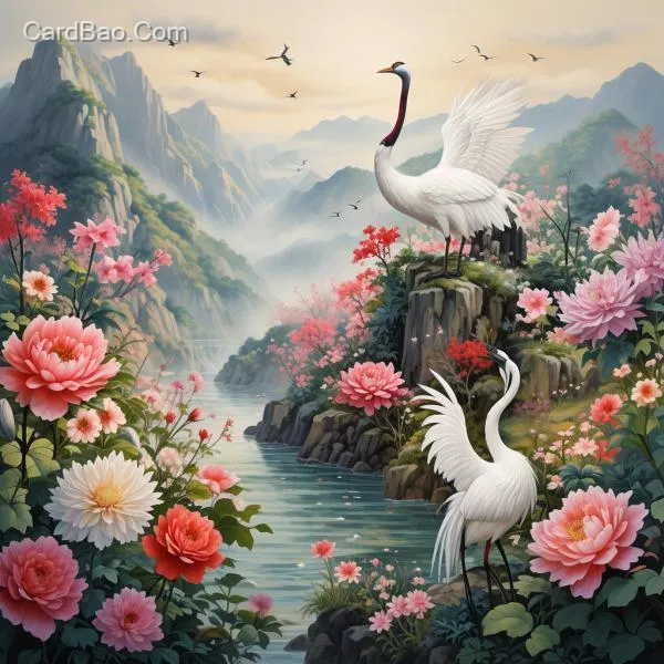 The landscape is like a painting, with clusters of flowers and cranes, creating a magnificent scene.
