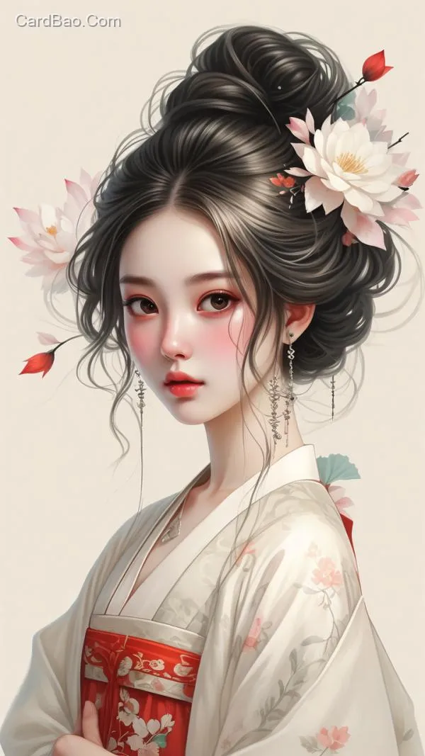 Oriental beauty avatar, elegance surpassing all ages, lotus flowers shy before her jade-like face, minimalist cartoon style.