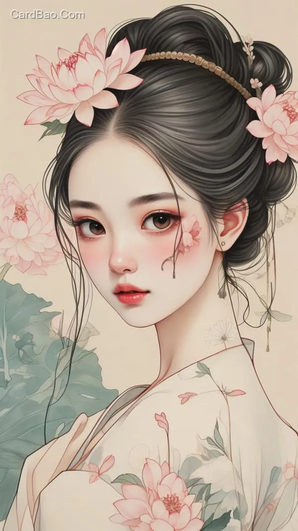 Oriental beauty avatar, elegance that outshines the past and present, lotus flowers shy away from her jade-like complexion, simple cartoon style.