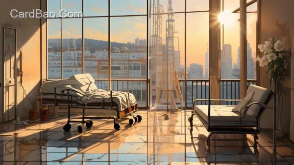 In this tenderly enveloped scene of the hospital room, every inch of space is filled with unspoken warmth and hope. Soft sunlight filters through the half-drawn curtains, casting dappled, shifting patterns of light and shadow like the gentle whispers of time, softly brushing over the serene surroundings. The room is adorned in warm tones of beige and light wood, creating a homely sense of comfort and tranquility that allows one to forget the noise and pain of the outside world.