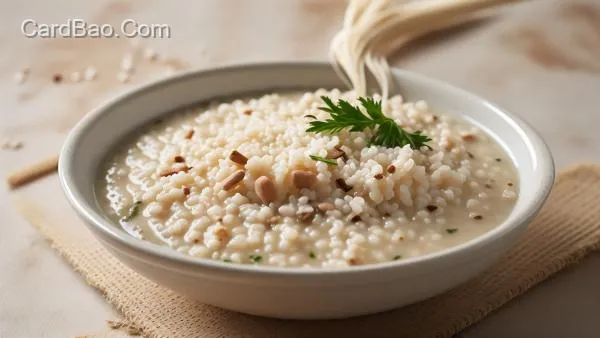 一碗清淡的白粥,盛放在一个白色的陶瓷碗中。粥的质地细腻,米粒煮得软烂。粥的表面微微冒着热气,碗的边缘点缀着几片翠绿的葱花和一小撮香菜,增添了一丝色彩和香气。背景是一个简约的木质桌面,整体氛围温馨舒适,适合早餐或病后调养的场景。
