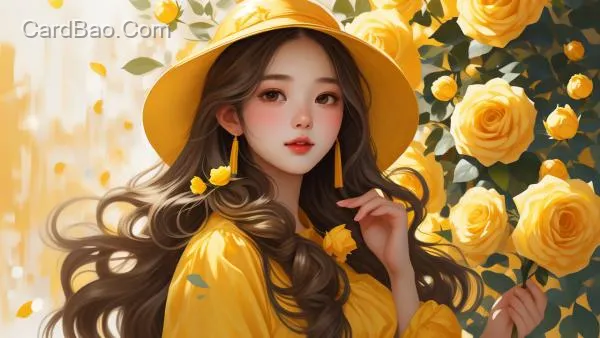 Beautiful girl, long hair, delicate features, wearing a yellow dress and a yellow hat, holding a bouquet of yellow roses against a yellow rose background, in a fresh and healing aesthetic style, with a touch of elegance.