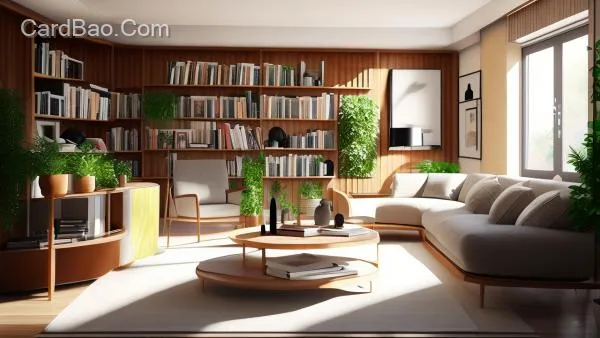 Living room, bookshelf wall, green plants, Tyndall effect light.