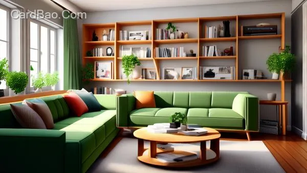 Living room, bookshelf wall, green plants, Tyndall effect light.