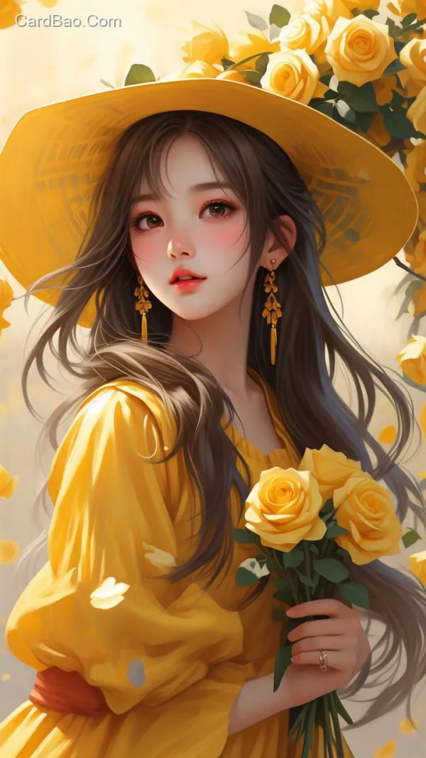 A beautiful girl with long hair and delicate facial features, wearing a yellow dress and a yellow hat, holding a bouquet of yellow roses against a yellow rose background, in a light and fresh, healing, and aesthetic style.