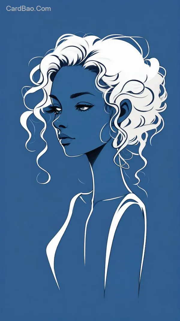 手绘插画风,极简,头像,宝蓝色背景,白色的人物剪影,卡通,少女侧脸,大波浪长卷发,线条