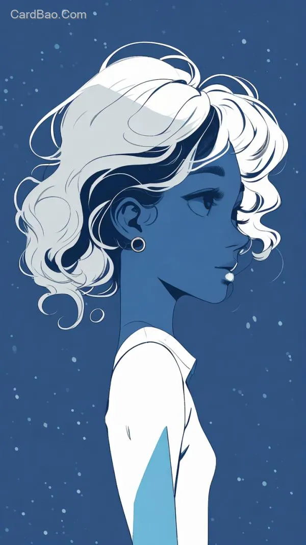 手绘插画风,极简,头像,宝蓝色背景,白色的人物剪影,卡通,少女侧脸,大波浪长卷发,线条