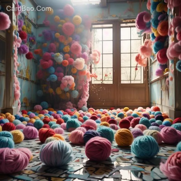The floor of the eerie room is entirely covered with colorful yarn balls, sparking whimsical imagination.