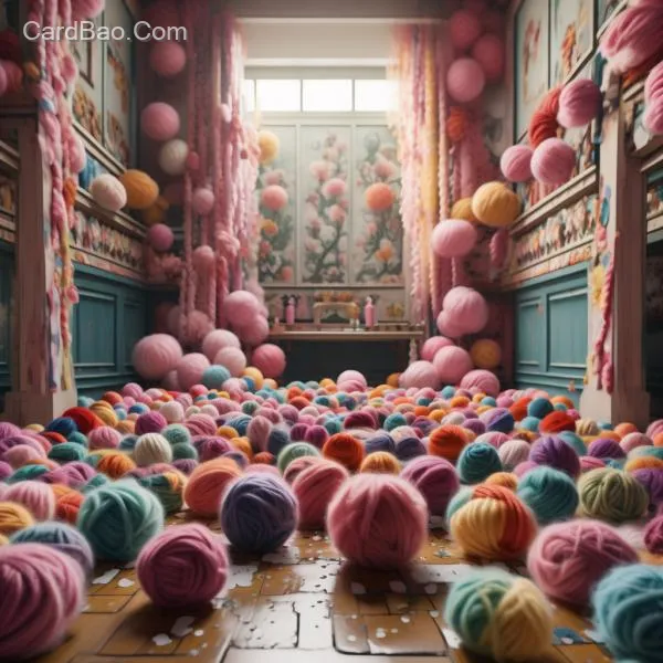 The floor of the eerie room is entirely covered with colorful yarn balls, sparking whimsical imagination.