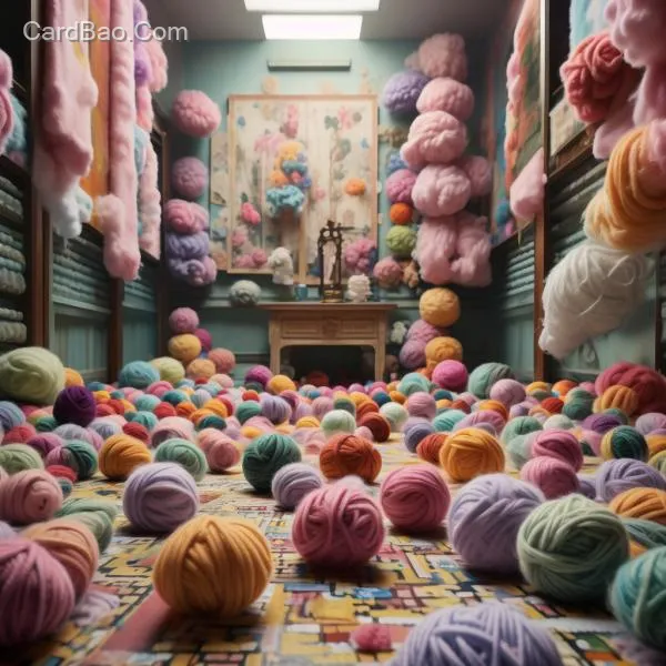 The floor of the eerie room is entirely covered with colorful yarn balls, sparking whimsical imagination.