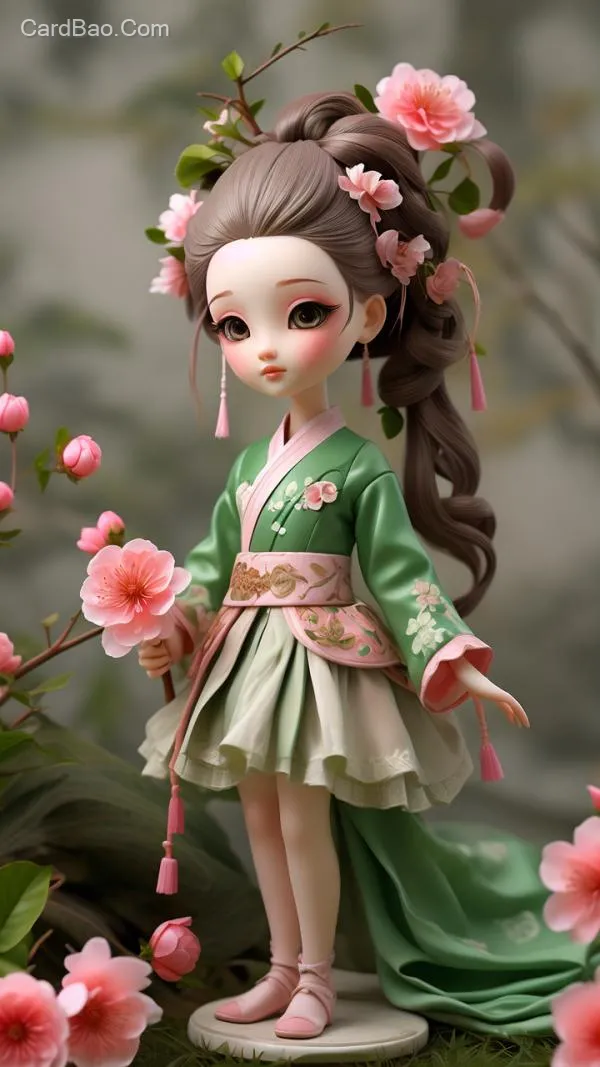 桃花娃娃Q版 粉色头发,绿色裙子 国潮 手办 高清特写 全身 可爱 细节丰富 草地背景