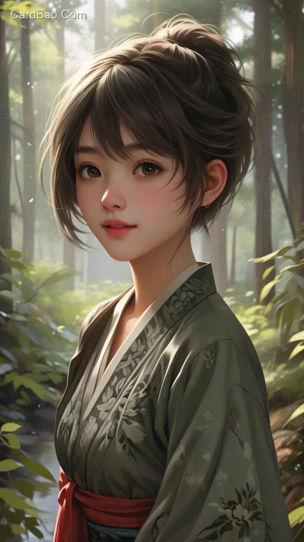 Short hair, modern girl, slight smile, stepmother vibe, forest background