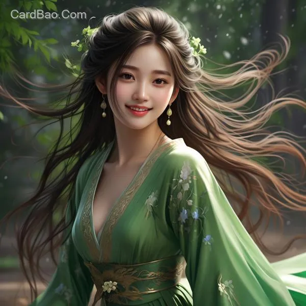 青绿色衣服, 美女, 长发, 直发, 灵气, 全身, 微笑, 4K