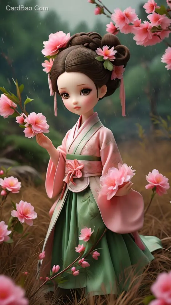 桃花娃娃Q版 粉色头发,绿色裙子 国潮 手办 高清特写 全身 可爱 细节丰富 草地背景