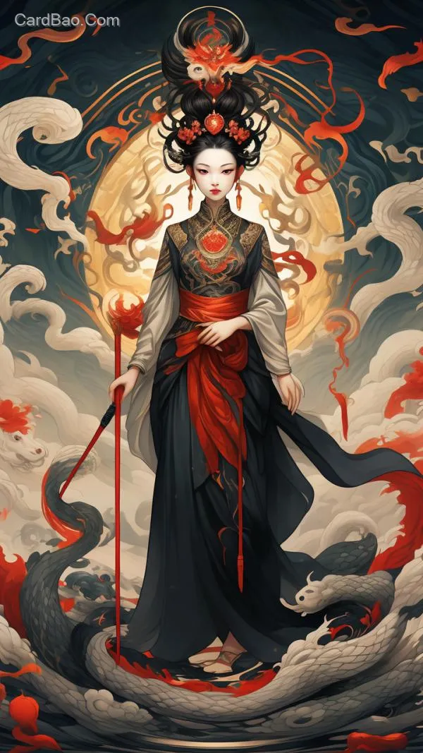 蛇身人面像的女娲在补天,中国传统神话风格,突出蛇身的元素