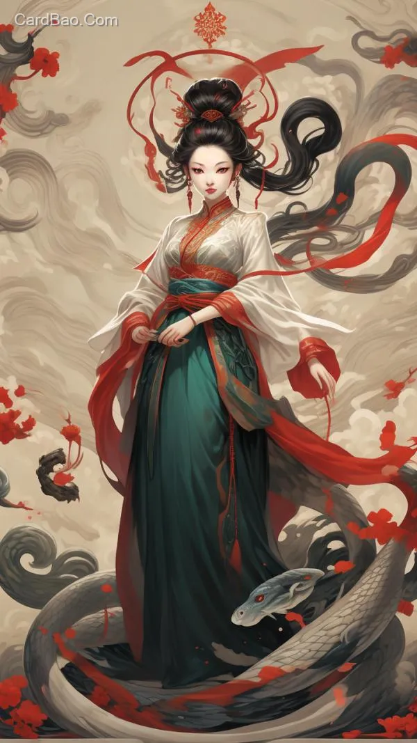 蛇身人面像的女娲在补天,中国传统神话风格,突出蛇身的元素