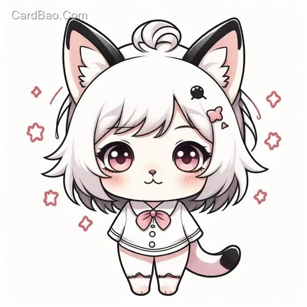 Draw a fried dumpling cat girl, who is a cat girl with soft fur. Her ears are pointed cat ears, white in color with a faint pink on the inside. Her eyes are large and bright, like the brightest stars in the night sky, sparkling with curiosity and wit. Her white tail is fluffy and sways gently with her emotions. She has long black hair. She is wearing a school uniform with elements of cats and fried dumplings, such as small cat patterns on the collar or cuffs, decorated with fried dumpling-shaped designs, blending tradition with cuteness. Her overall appearance combines the agility of a cat with the sweetness of a young girl.